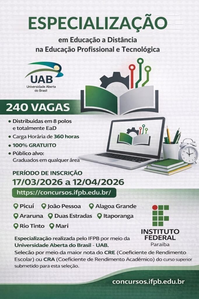 O Instituto Federal da Paraíba (IFPB), por meio da Universidade Aberta do Brasil (UAB), está com inscrições abertas para a Especialização em Educação a Distância na Educação Profissional e Tecnológica. O curso é totalmente gratuito, na modalidade a distância, e oferece 240 vagas distribuídas em oito polos presenciais no estado da Paraíba.