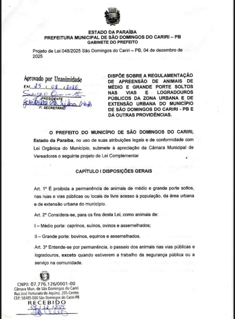A Câmara Municipal de São Domingos do Cariri aprovou na ultima sessão ordinária na tarde da ultima quarta-feira, (25), por unanimidade um projeto de lei PL 048/2025, que proíbe a circulação de animais de médio e grande porte soltos em ruas e espaços públicos do município.