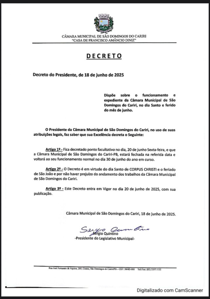 A Câmara Municipal de São Domingos do Cariri decretou ponto facultativo para a próxima sexta-feira, dia 20 de junho de 2025. De acordo com o decreto assinado pelo presidente do Legislativo, Sérgio Quintino, o expediente será suspenso em virtude do dia santo de Corpus Christi e das festividades de São João.