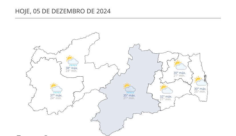 No Cariri, as temperaturas seguem elevadas, com a máxima podendo atingir 35°C e a mínima 21°C, acompanhadas da possibilidade de chuvas isoladas.