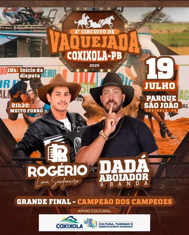 A cidade de Coxixola, no Cariri paraibano, se prepara para viver mais um momento histórico com a realização da grande final do 3º Circuito de Vaquejada, apoiado culturalmente pela Prefeitura Municipal, por meio da Secretaria de Cultura, Turismo e Desenvolvimento Econômico. A competição, considerada uma iniciativa pioneira na região, consolidou-se como um dos maiores eventos voltados à valorização da tradição nordestina e da vaqueirama local.