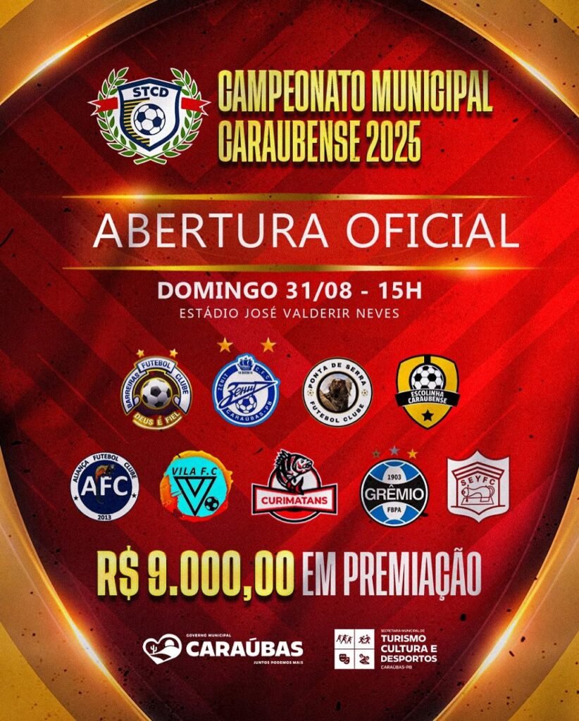 A abertura oficial do Campeonato Municipal Caraubense de Futebol 2025 terá início a partir das 14h30 deste domingo, e logo após a bola vai rolar em três grandes jogos no Estádio José Valderi Neves, palco dos jogos da competição.
