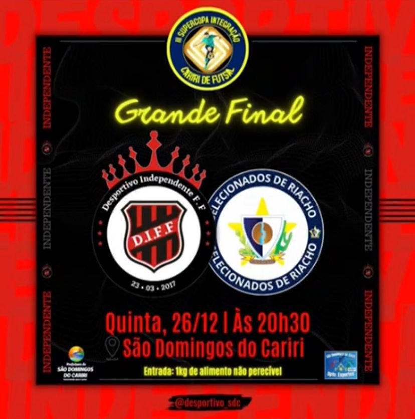 A decisão acontece no Ginásio de Esportes da cidade, a partir das 20h30, e promete muita emoção entre as equipes: Independente SDC e a Seleção de Riacho de Santo Antônio.