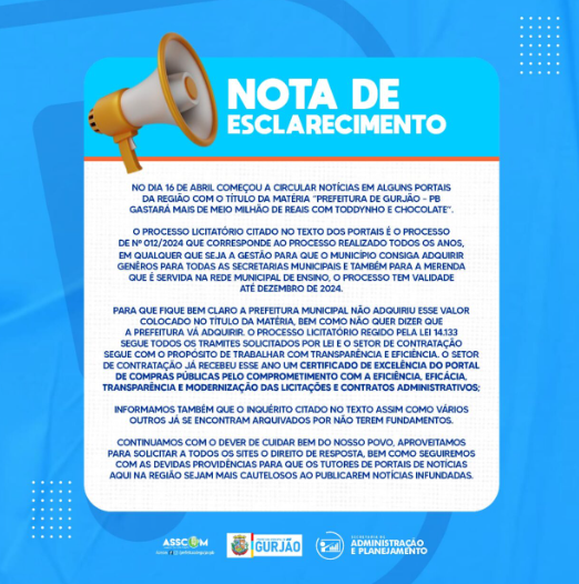 A Prefeitura de Gurjão, na gestão do prefeito Zé Elias, divulgou nesta quarta-feira (17), uma nota de esclarecimento sobre matérias divulgadas em portais da região referente a uma compra de R$ 500 mil para materiais de consumo, como toddynho e chocolate.