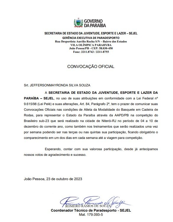 Após ser destaque nos jogos em julho desse ano levando primeiro lugar em arremesso de peso e lançamento de dardo. Mayron teve a convocação pra participar da seleção paraibana, jogos que irá acontece entre os dias 04 a 10 de dezembro em Niterói-RJ.