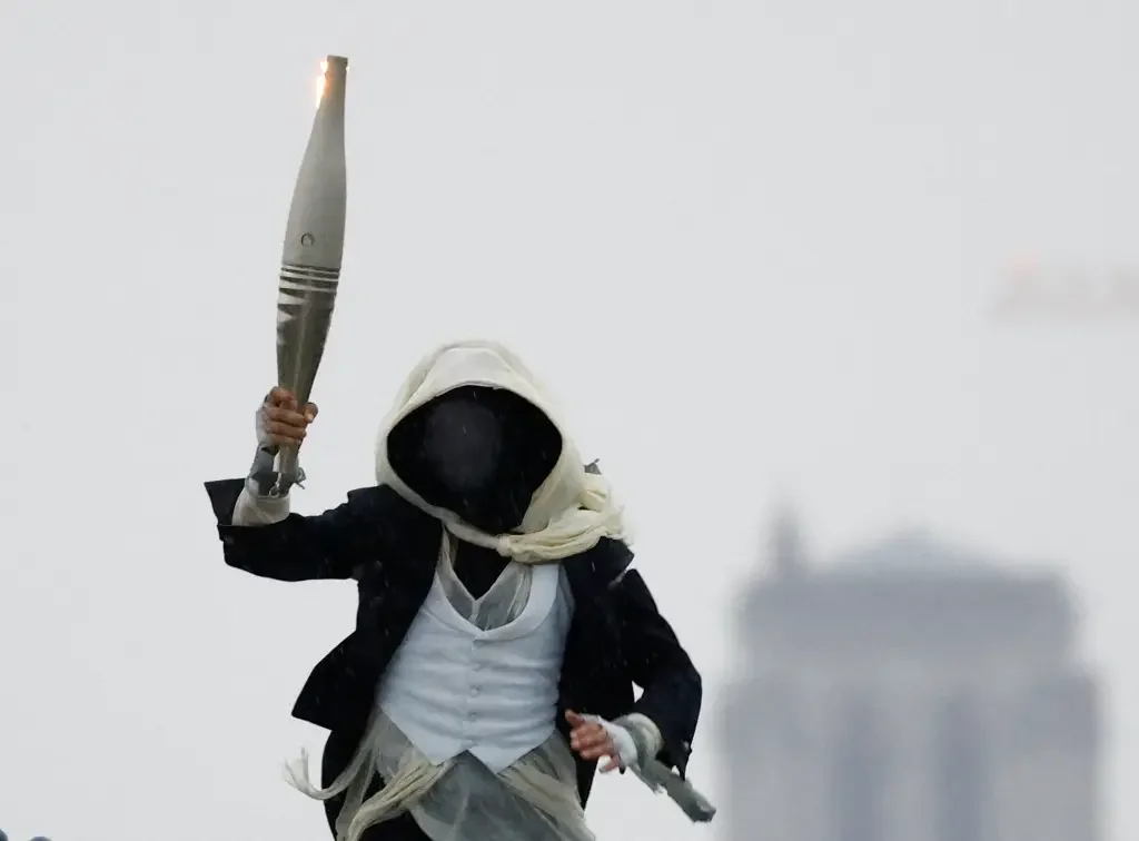 A tocha olímpica foi percorrida ao longo de toda a apresentação por uma figura encapuzada, que faz referência ao personagem do jogo “Assassin’s Creed”. Misturando momentos em vídeo e apresentações ao vivo, o representante percorreu os telhados que cercam o Rio Sena com a tocha em mãos.