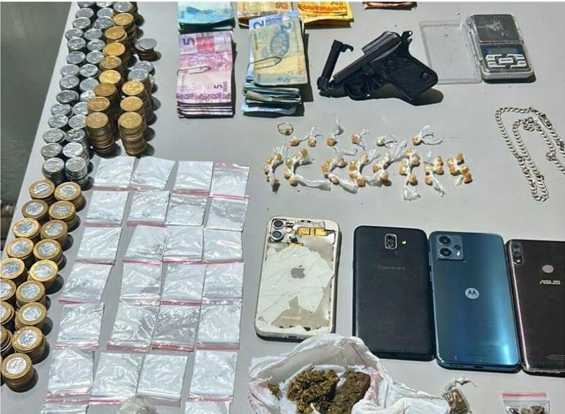 Durante buscas nas imediações onde o indivíduo se encontrava, foram localizadas substâncias análogas a crack, maconha e cocaína, além de uma arma de fogo, dinheiro em espécie e cinco aparelhos celulares.