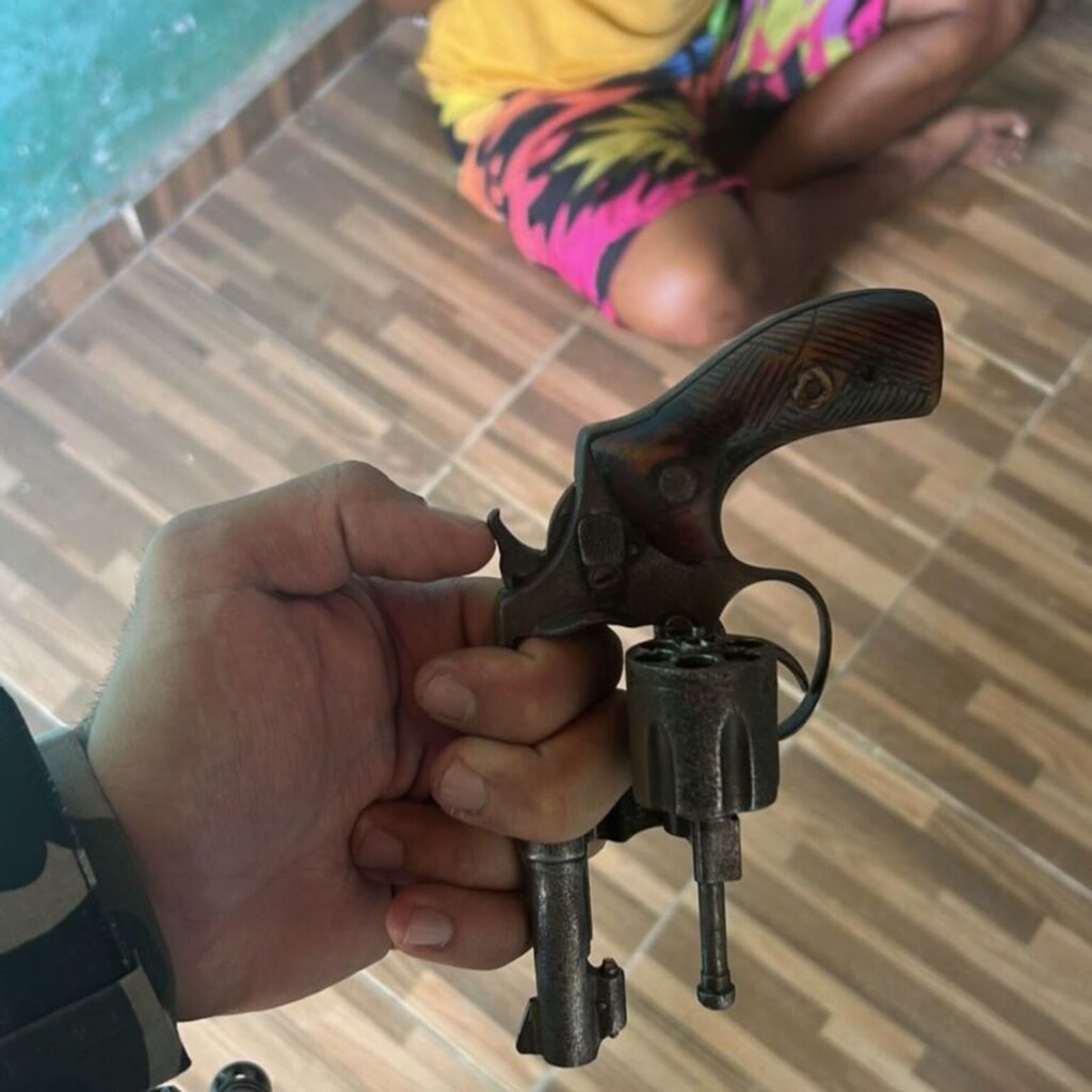 Diante da situação, foi dada voz de prisão e, durante buscas no interior da residência do acusado, os policiais localizaram um revólver calibre .32, municiado com projéteis, escondido sob o sofá da sala. Ao lado do móvel, também foi apreendida uma quantia em dinheiro.