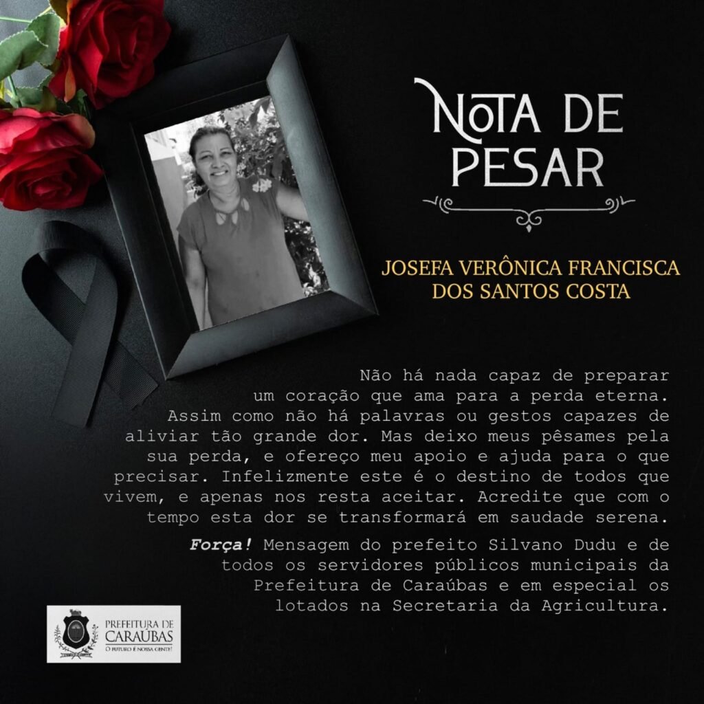 O prefeito do município de Caraúbas, Silvano Dudu, emitiu nas primeiras horas da manhã desta segunda-feira, dia 21, Nota de Pesar, pelo falecimento precoce da senhora Josefa Verônica Francisca dos Santos Costa, mais carinhosamente conhecida como Vevé, ocorrido no final da tarde deste domingo.