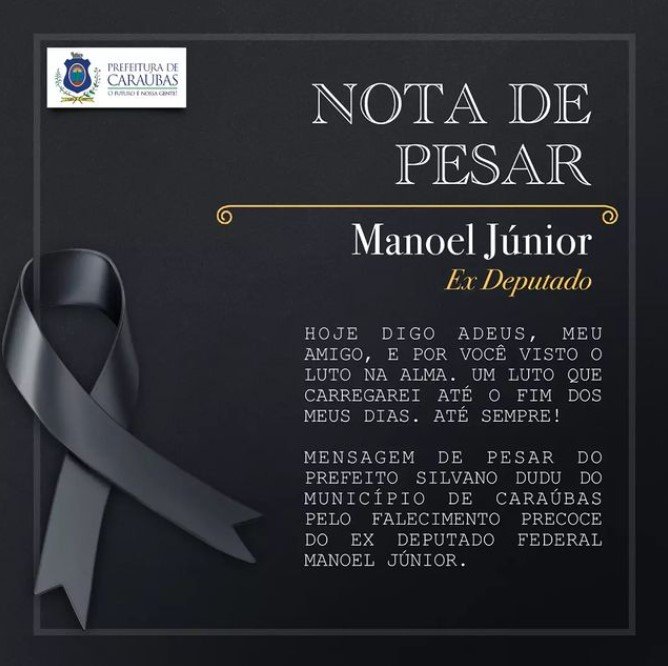 Em vida e durante sua permanência no Congresso Nacional ajudou Caraúbas através de Emendas que garantiram o desenvolvimento do nosso município. Mensagem do prefeito Silvano Dudu aos familiares e amigos do ex deputado Manoel Júnior.