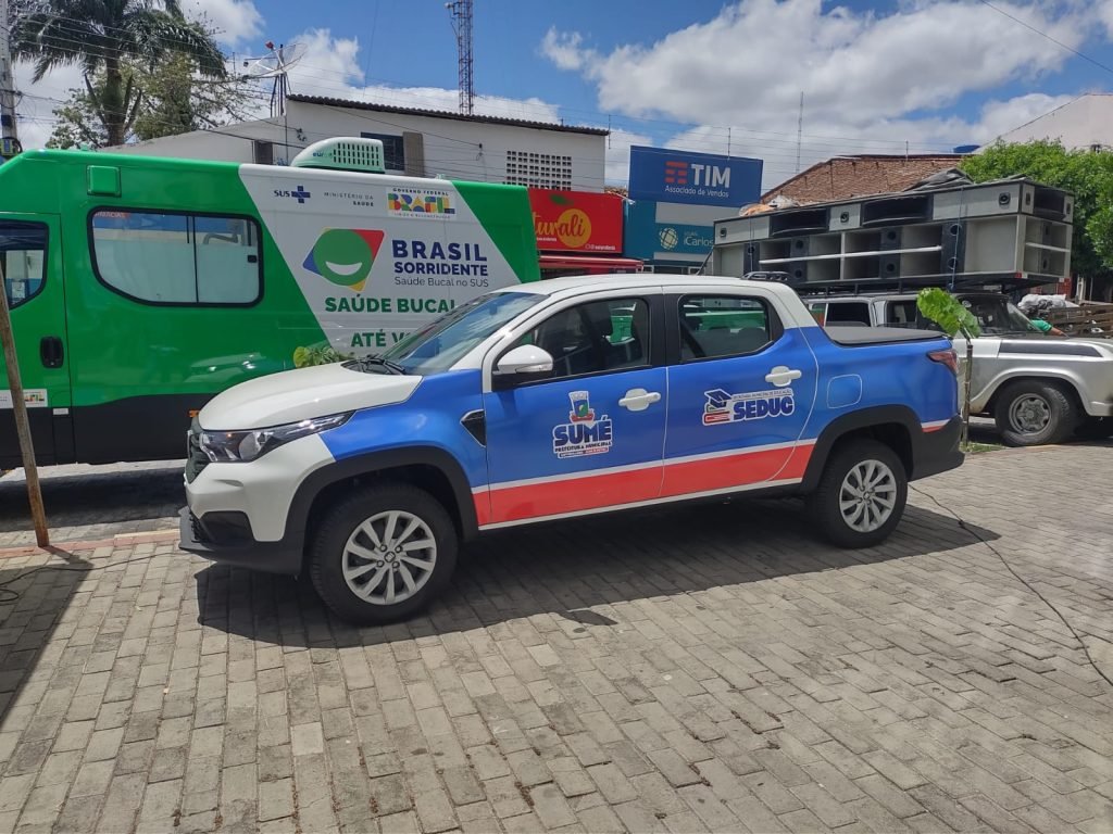 Informe Publicitário– Na manhã de segunda-feira (1º), a Prefeitura de Sumé realizou uma cerimônia especial para oficializar a entrega de três importantes veículos que reforçam as áreas de saúde e educação do município: uma Unidade Móvel Odontológica, uma ambulância tipo B, equipada para atendimentos de urgência, e uma Fiat Strada destinada à Secretaria da Educação.
