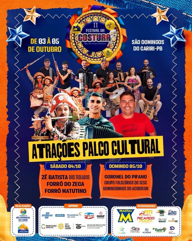 A Prefeitura de São Domingos do Cariri, através da Secretaria de Eventos e Turismo, divulgou nesta semana as atrações que irão se apresentar no Palco Cultural durante o II Festival da Costura, que acontece nos dias 03, 04 e 05 de outubro, na Praça Central do município.