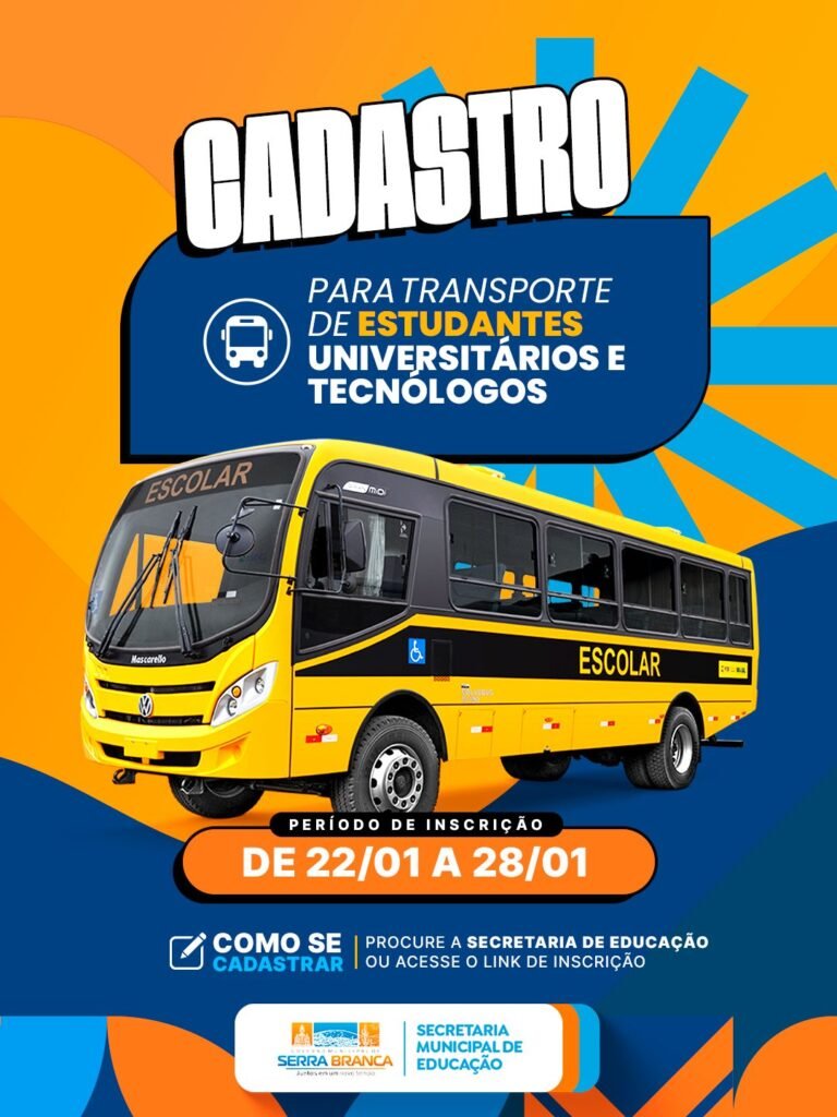 Prefeitura Municipal de Serra Branca, por meio da Secretaria Municipal de Educação, iniciou no dia 22 de janeiro o cadastramento dos estudantes universitários e tecnólogos que utilizam o transporte gratuito ofertado pelo município. O prazo para inscrição segue até o dia 28 de janeiro, garantindo, mais uma vez, acesso organizado e igualitário ao transporte estudantil.