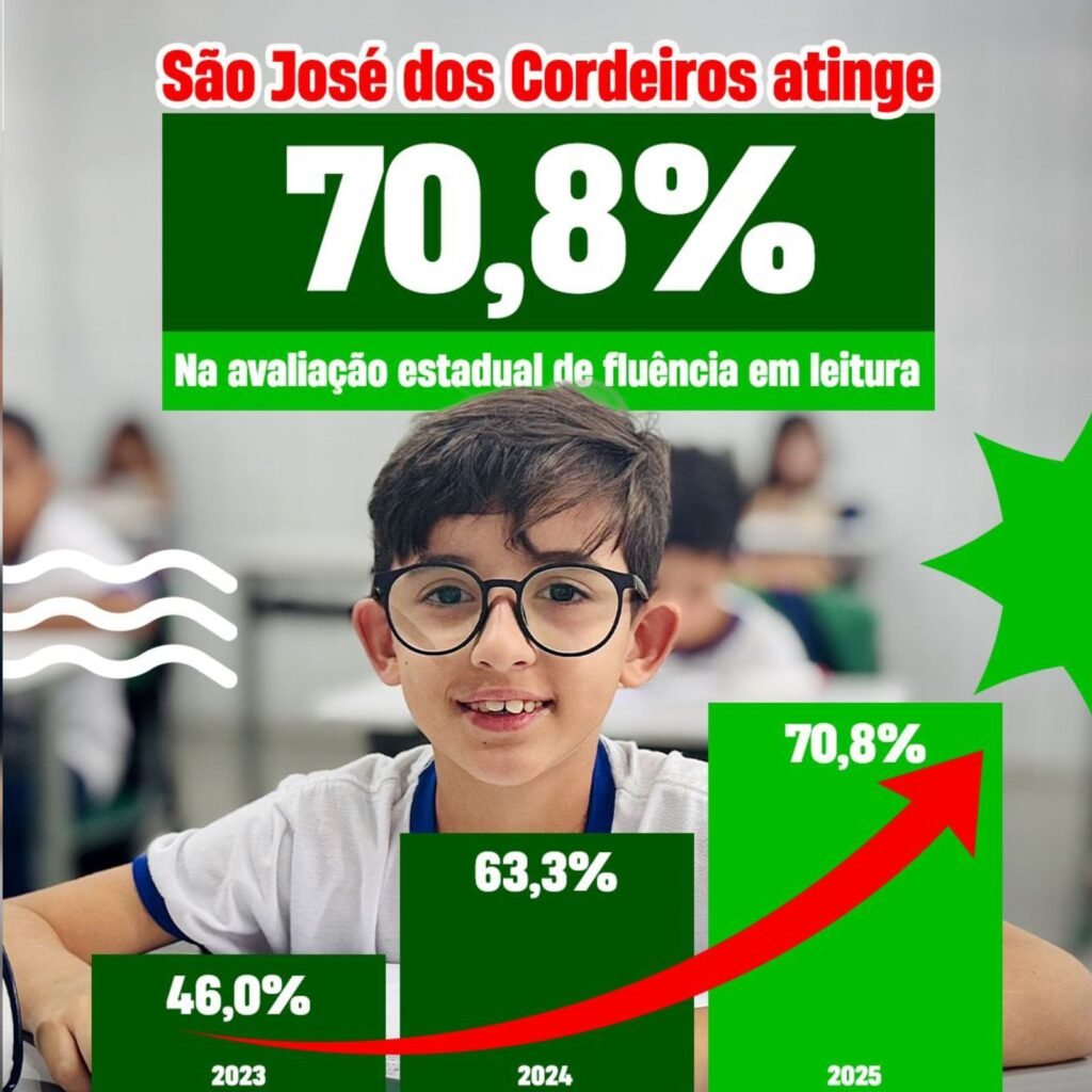 O município de São José dos Cordeiros registrou um importante avanço nos índices de alfabetização em 2025. De acordo com dados educacionais, 70,8% dos alunos do 2º ano do Ensino Fundamental já são considerados leitores, número que representa um crescimento expressivo em comparação com a avaliação de entrada, que apontava 26,9%.