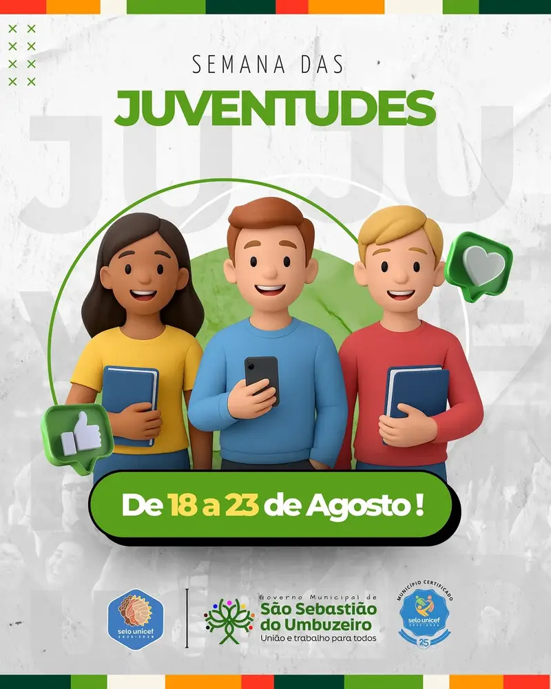 A Prefeitura de São Sebastião do Umbuzeiro, sob a gestão da prefeita Adalcy, realizará de 18 a 23 de agosto a Semana das Juventudes, evento voltado para jovens de 13 a 29 anos com o objetivo de promover aprendizado, troca de experiências e valorização do potencial da juventude local.