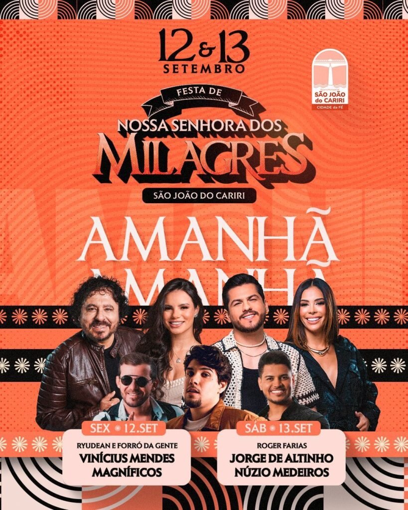 A Festa de Nossa Senhora dos Milagres, padroeira de São João do Cariri, já está em andamento há alguns dias com a programação religiosa, que reúne fiéis em missas, novenas e momentos de fé. Agora, será a vez da parte social do evento ganhar destaque com o início da programação de shows, que acontece nesta sexta-feira, 12 de setembro.