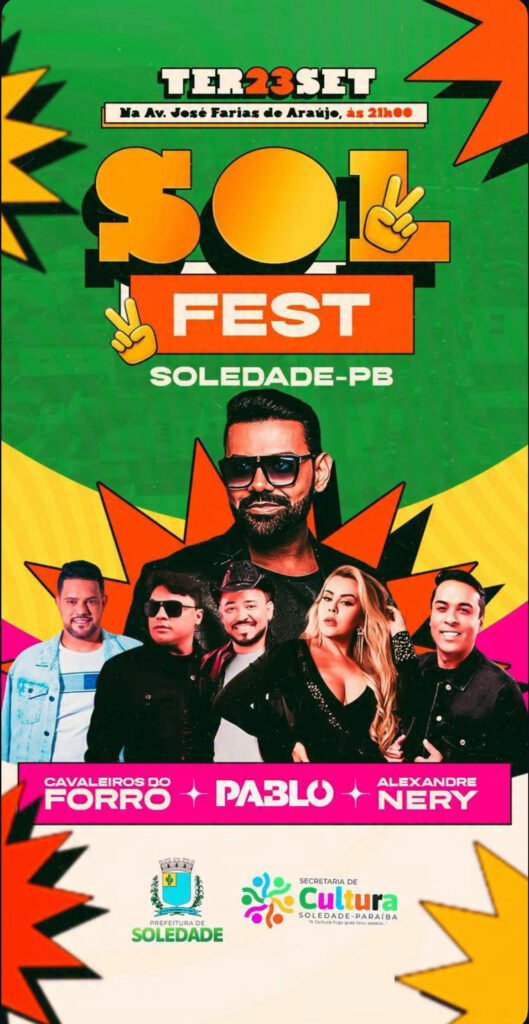 Já o SolFest acontece nesta terça, no dia 23 de setembro, a partir das 22h, na Avenida José Farias de Araújo, com a realização do SolFest, que promete agitar a cidade com grandes atrações musicais.