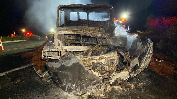 O caminhão ficou parcialmente danificado, enquanto o carro de passeio foi completamente destruído pelas chamas.